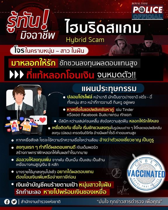 3 เม.ย. 2565 04:01:17รู้ทันมิจฉาชีพ ไฮบริดสแกม Hybrid Scam โจรในคราบหนุ่ม – สาว ในฝัน มาหลอกให้รัก ชักชวนลงทุนผลตอบแทนสูง ที่แท้หลอกโอนเงิน จนหมดตัว!! แผนประทุษกรรม ปลอมโปรไฟล์ เป็นคนหน้าตาดี มักเป็นชาวต่างชาติ ทั้งหนุ่ม สาว ฝรั่งหน้าที่การงานดี หนุ่มตี๋หล่อ รูปร่างดี กินหรู อยู่แพง หาเหยื่อในแอปพลิเคชันหาคู่ เช่น Tind...