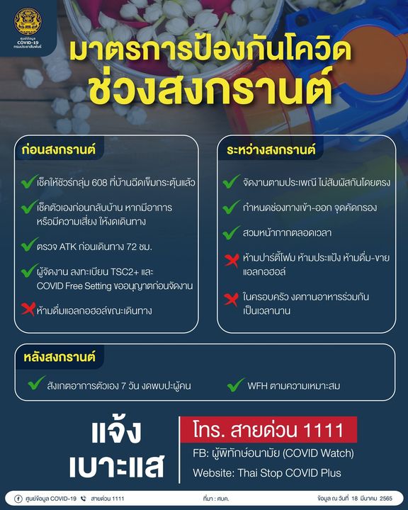 19 มี.ค. 2565 01:45:28มาตรการป้องกันโควิดช่วงสงกรานต์ • ก่อนสงกรานต์ ✔️เช็คให้ชัวร์กลุ่ม 608 ที่บ้านฉีดเข็มกระตุ้นแล้ว ✔️เช็คตัวเองก่อนกลับบ้าน หากมีอาการหรือมีความเสี่ยง ให้งดเดินทาง ✔️ตรวจ ATK ก่อนเดินทาง 72 ชม. ✔️ ผู้จัดงาน ลงทะเบียน TSC2+ และ COVID Free Setting ขออนุญาตก่อนจัดงาน ❌ห้ามดื่มแอลกอฮอล์ขณะเดินทาง • ระหว่า...