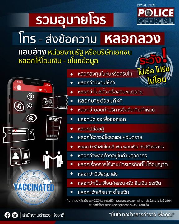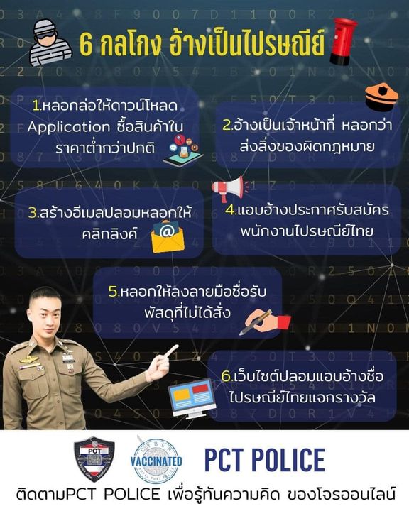 24 มี.ค. 2565 09:25:40🚛6 กลโกง อ้างเป็นไปรษณีย์ไทย‼ 1️⃣หลอกล่อให้ดาวน์โหลด Application ซื้อสินค้าในราคาต่ำกว่าปกติ มิจฉาชีพมักจะแอบอ้างเป็นเจ้าหน้าที่ไปรษณีย์ไทย ติดต่อผู้ใช้บริการผ่านทางโทรศัพท์ SMS ไลน์ ด้วยบัญชีปลอมในชื่อต่างๆ เช่น EMS Thailandpost ไปรษณีย์ ว่ามีคะแนนสะสมที่ใกล้จะหมดอายุ พร้อมให้ลิงค์ดาวน์โหลดแอปพลิเค...