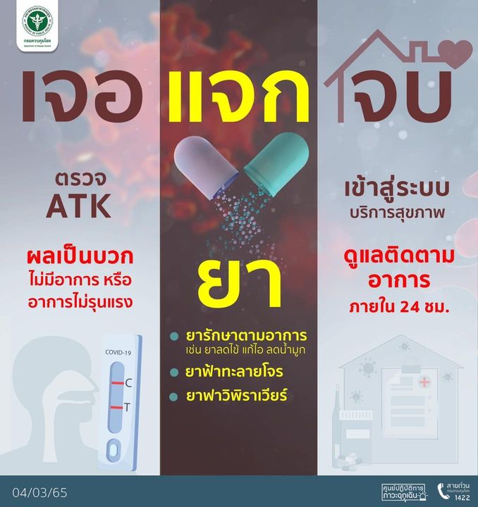 5 มี.ค. 2565 04:25:46🏥 แนวทางการดูแลผู้ติดเชื้อโควิด-19 แบบ "เจอ แจก จบ" ซึ่งส่วนใหญ่แล้วใช้กับผู้ป่วยนอกที่อาการไม่รุนแรง ไม่ต้องนอนโรงพยาบาล ควบคู่ไปกับระบบการดูแลรักษาที่บ้านหรือชุมชน (HI/CI) 👨⚕️👩⚕️ โดยเมื่อผู้ป่วยได้ยืนยันผลเป็นบวกด้วย ATK แล้ว และได้ทำการแจ้งขอเข้ารับการรักษาในระบบ แพทย์จะพิจารณาจ่ายยารั...