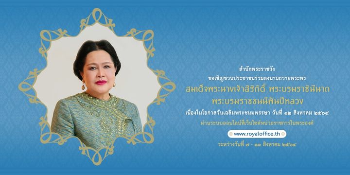 7 ส.ค. 2564 01:00:09สำนักพระราชวัง ขอเชิญชวนประชาชนร่วมลงนามถวายพระพร สมเด็จพระนางเจ้าสิริกิติ์ พระบรมราชินีนาถ พระบรมราชชนนีพันปีหลวง เนื่องในโอกาสวันเฉลิมพระชนมพรรษา วันที่ ๑๒ สิงหาคม ๒๕๖๔ ผ่านระบบออนไลน์ ที่เว็บไซต์หน่วยราชการในพระองค์ www.royaloffice.th ระหว่างวันที่ ๗ – ๑๓ สิงหาคม ๒๕๖๔...
