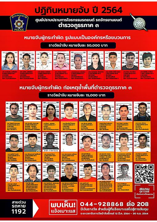 20 มี.ค. 2564 02:52:21ศูนย์ปราบปราบการโจรกรรมรถยนต์ รถจักรยานยนต์ ตำรวจภูธรภาค 3 (ศปจร.ภ.3) โดยผู้บัญชาการตำรวจภูธรภาค 3 ได้ทำโครงการปฏิทินหมายจับประจำปี 2564 .... ท่านใดแจ้งเบาะแสจนจับกุมผู้ต้องหาตามหมายจับในปฏิทินนี้ได้ จ่ายเงินตามที่ระบุในปฏิทินทันทีเมื่อส่งตัวผู้ต้องหาให้พนักงานสอบสวน สายด่วนรถหาย 1192 พบเห็นแจ้ง...
