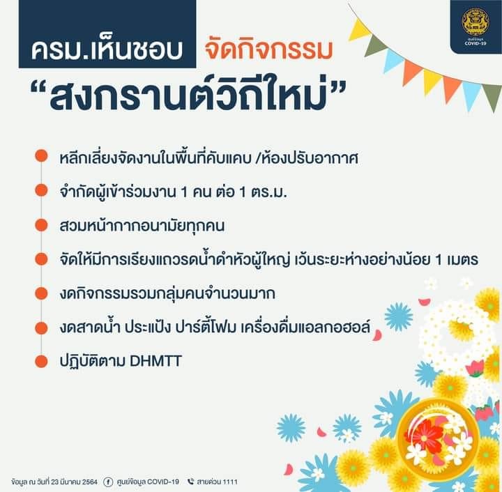 26 มี.ค. 2564 03:41:06กิจกรรม “สงกรานต์วิถีใหม่" สงกรานต์สุขใจ ขับขี่ปลอดภัย ห่างไกลโควิด... ครม. เห็นชอบตามที่ ศบค. เสนอแนวทางการการจัดงานและการจัดกิจกรรม งานวัน สงกรานต์วิถีใหม่ ขอให้หลีกเลี่ยงการจัดงานในพื้นที่คับแคบ หรือ พื้นที่ที่เป็นห้องปรับอากาศ ขอให้จัดในพื้นที่โล่งแจ้ง อากาศถ่ายเทสะดวก เป็นพื้นที่แสงแดดส่องถึง ...