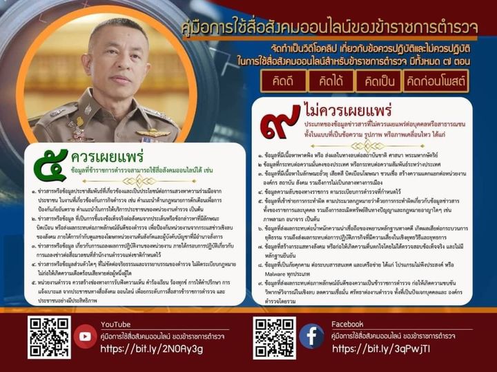 12 มี.ค. 2564 03:28:12ผบ.ตร. เปิดคู่มือการใช้สื่อสังคมออนไลน์ของตร. แนะ 9 ข้อ อย่าหาทำ 11 มีนาคม 2564 ที่สำนักงานตำรวจแห่งชาติ พล.ต.อ.สุวัฒน์ แจ้งยอดสุข ผบ.ตร. พร้อมด้วยพล.ต.อ.วิสนุ ปราสาททองโอสถ จเรตำรวจแห่งชาติ และพล.ต.ท.เชษฐา โกมลวรรถนะ หัวหน้าจเรตำรวจ ร่วมกันแถลงเปิดตัว “โครงการจัดทำแนวทางการใช้สื่อสังคมออนไลน์ของข้า...