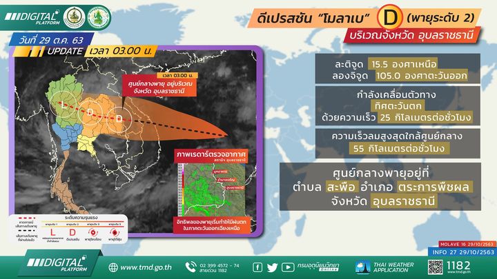 29 ต.ค. 2563 03:13:36📡พยากรณ์สภาพอากาศ 24 ชม.☔️ #คาดการณ์เส้นทางพายุ "โมลาเบ" บริเวณจังหวัด อุบลราชธานี Update เมื่อเวลา 03.00 น. ขณะนี้ พายุ พายุดีเปรสชัน "โมลาเบ" (พายุระดับ2) มีศูนย์กลางบริเวณ ตำบล สะพือ อำเภอ ตระการพืชผล จังหวัด อุบลราชธานี ละติจูด 15.5 องศาเหนือ ลองจิจูด 105.0 องศาตะวันออก พายุ กำลังเคลื่อนตัวท...
